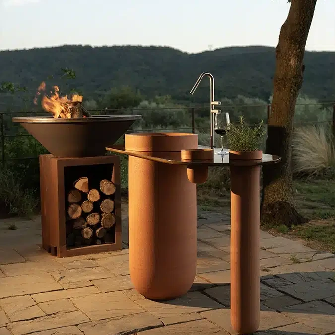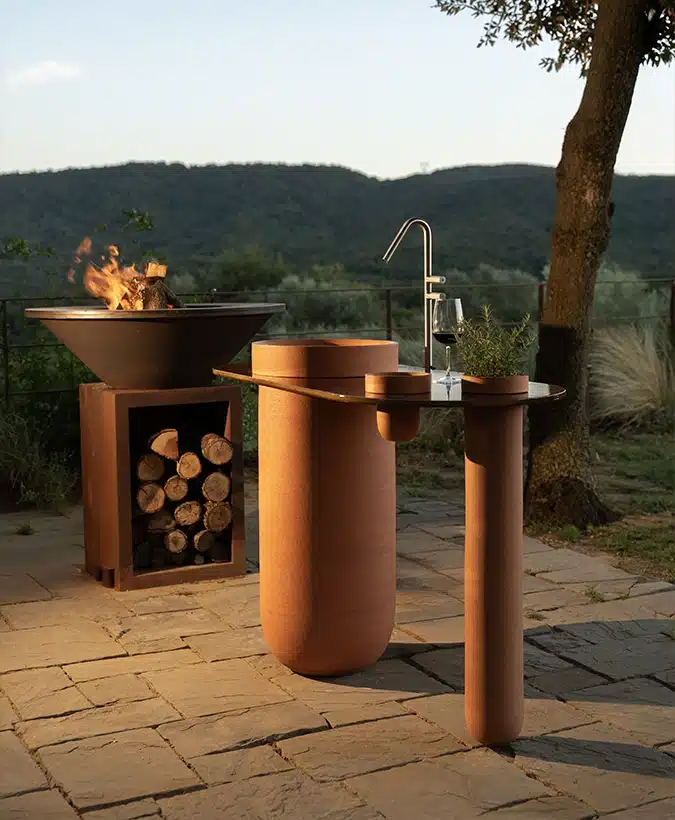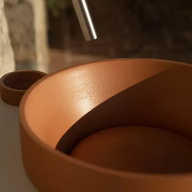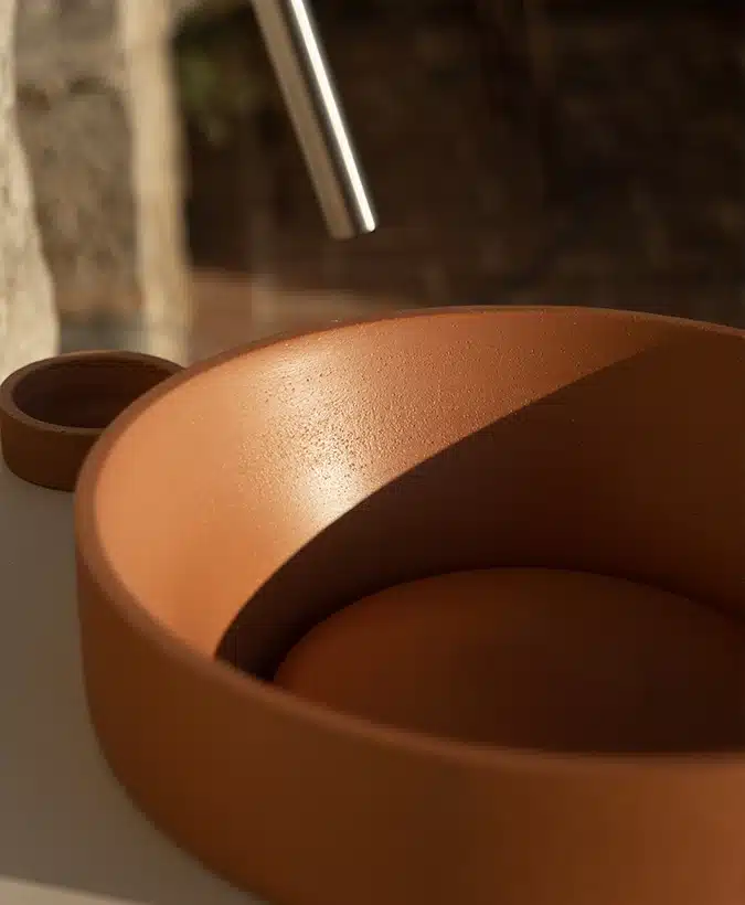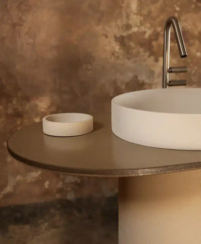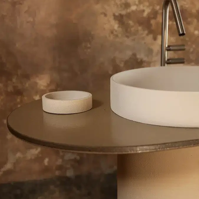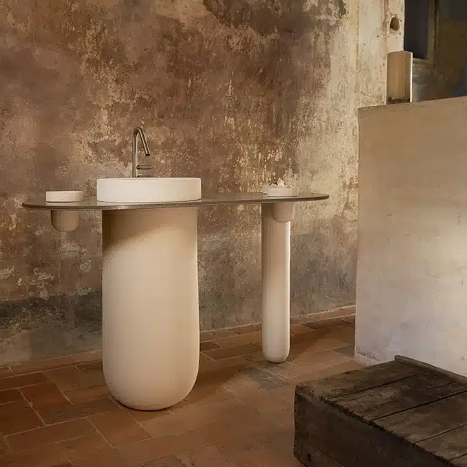 The console consists of two ceramic structural elements attached to the floor by mechanical fasteners: one, larger, can be used as a sink, while the other serves as an accessory. Completing the design is a series of suspended ceramic containers. The entire piece is intersected by a slim honeycomb aluminum top. Available in all finishes and earth tones, it is designed for floor or wall drainage.